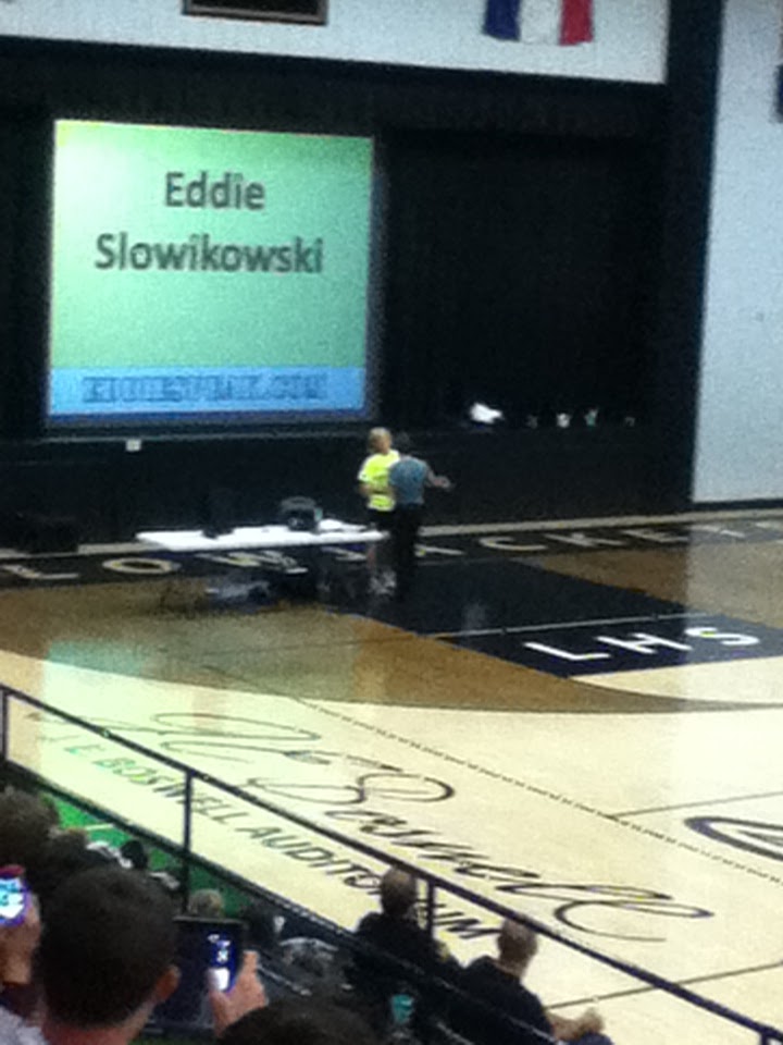 We all did a few cheers that were leaded by cheerleaders (again!) before Mr. Kevin Lowery, our principal, introduced a speaker that had came all the way from California. Eddie Slowikowski.